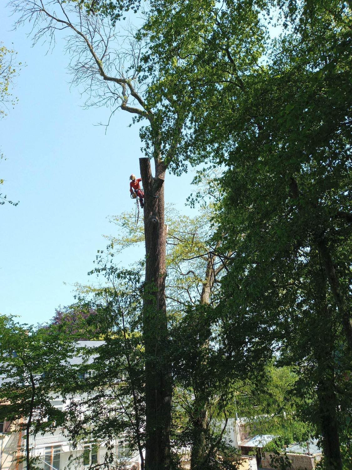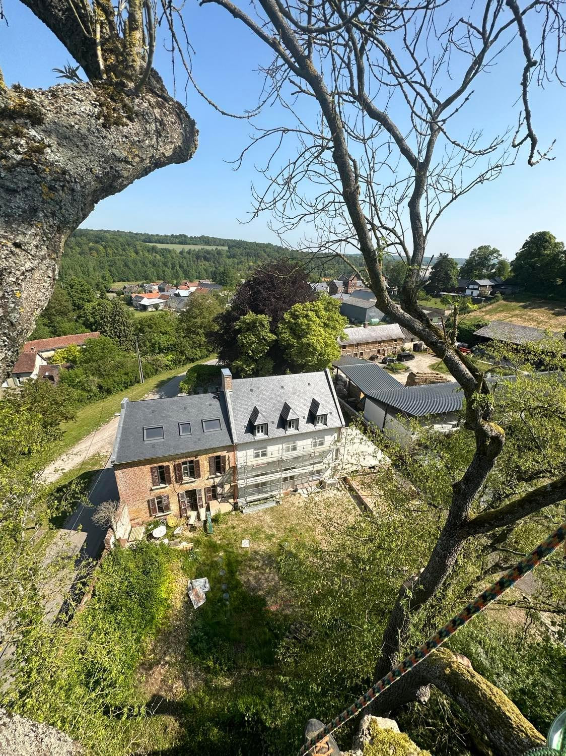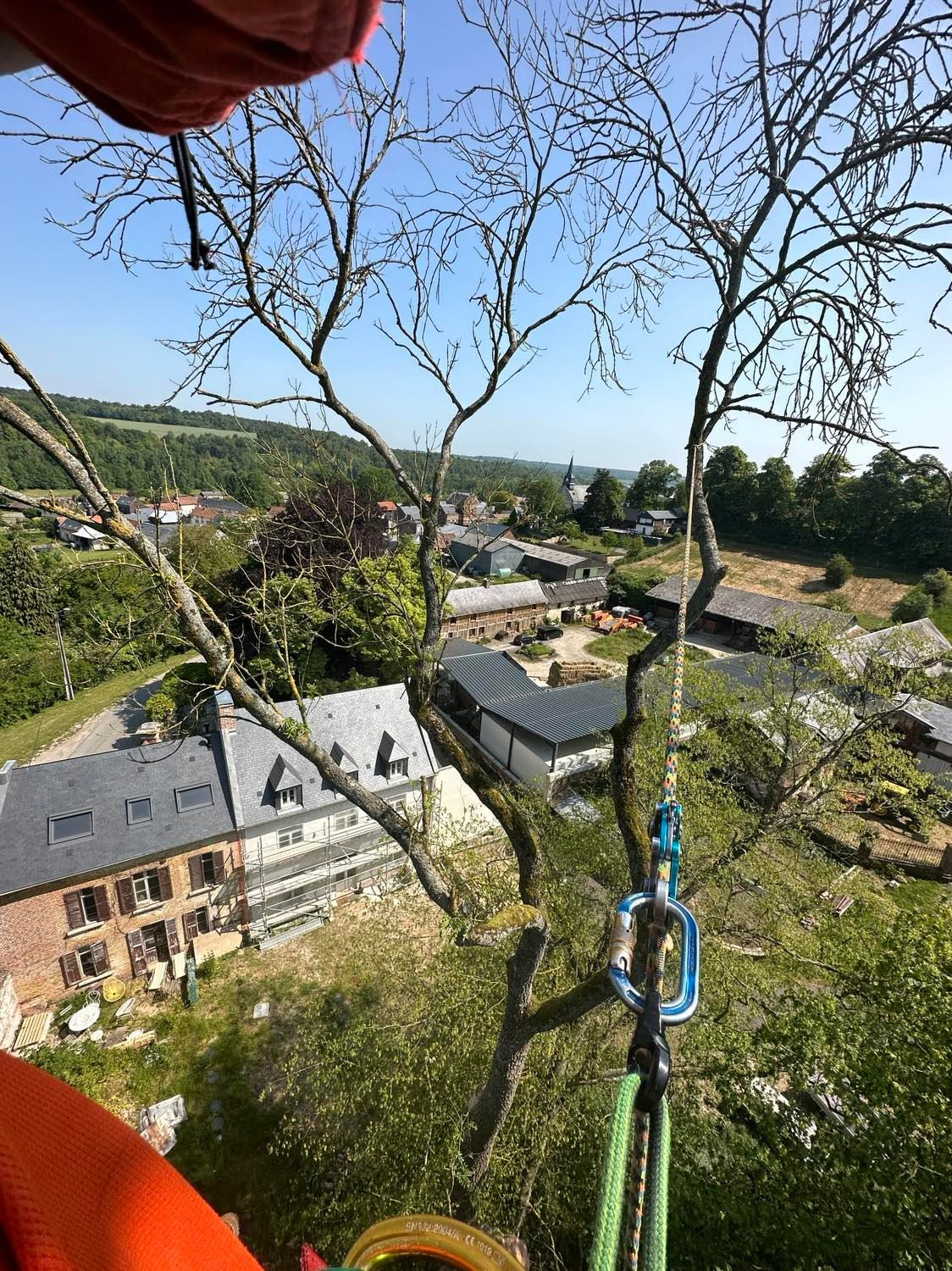 Abattage par démontage d’un Frêne élevé mort suite à l’attaque d’un champignon bouchant les vaisseaux du bois appelé « chalarose ». Abattage réalisé en rétention pour éviter tout dégât sur les tuyaux d’épandage de fausse septique.