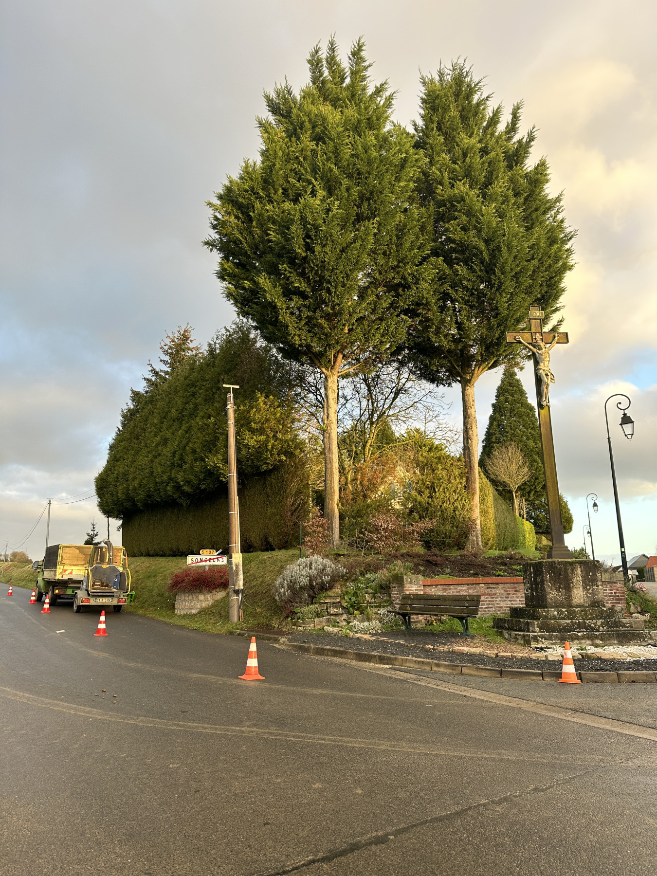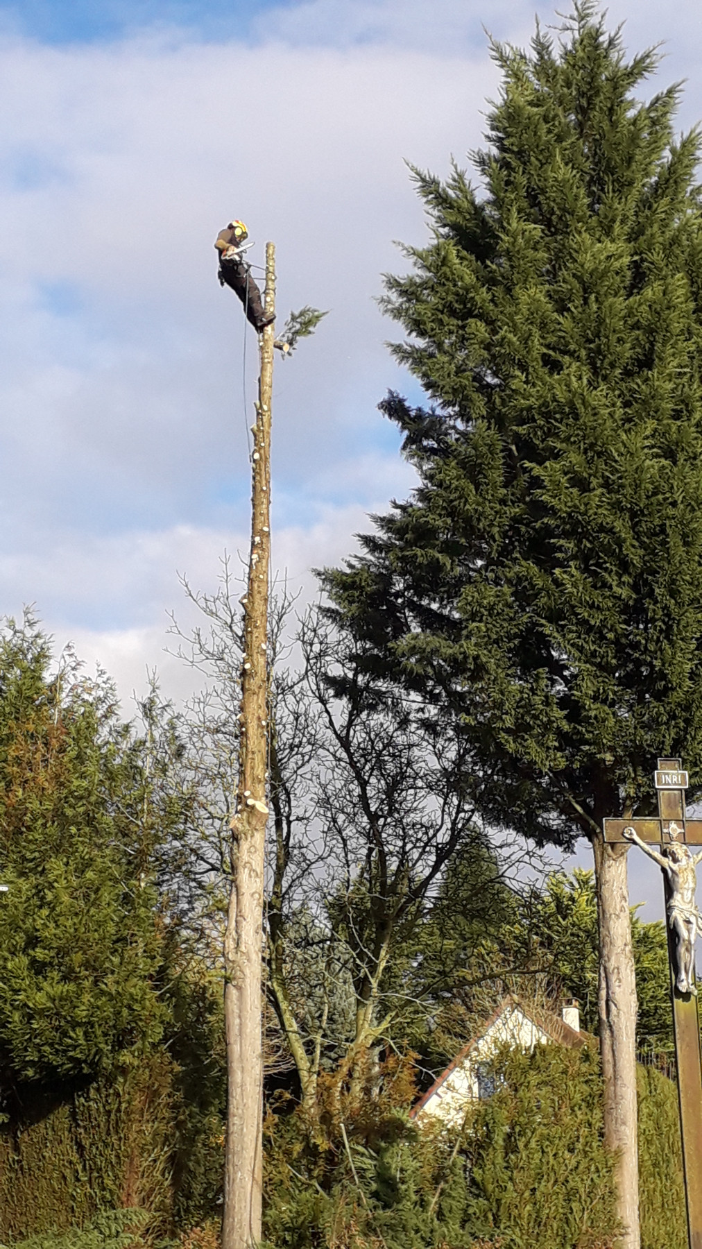 Abattage par démontage de deux arbres sur la commune de Songeons. Ces deux cyprès leylandii en port semi-libre avaient atteint un stade adulte qui ne permettait plus la cohabitation avec leur environnement urbain. Les deux arbres ont été abattus par le biais de mise en application de techniques de démontages en rétention. Dans un cadre sécurisé avec la mise en place de panneau de signalisation sur la voirie.