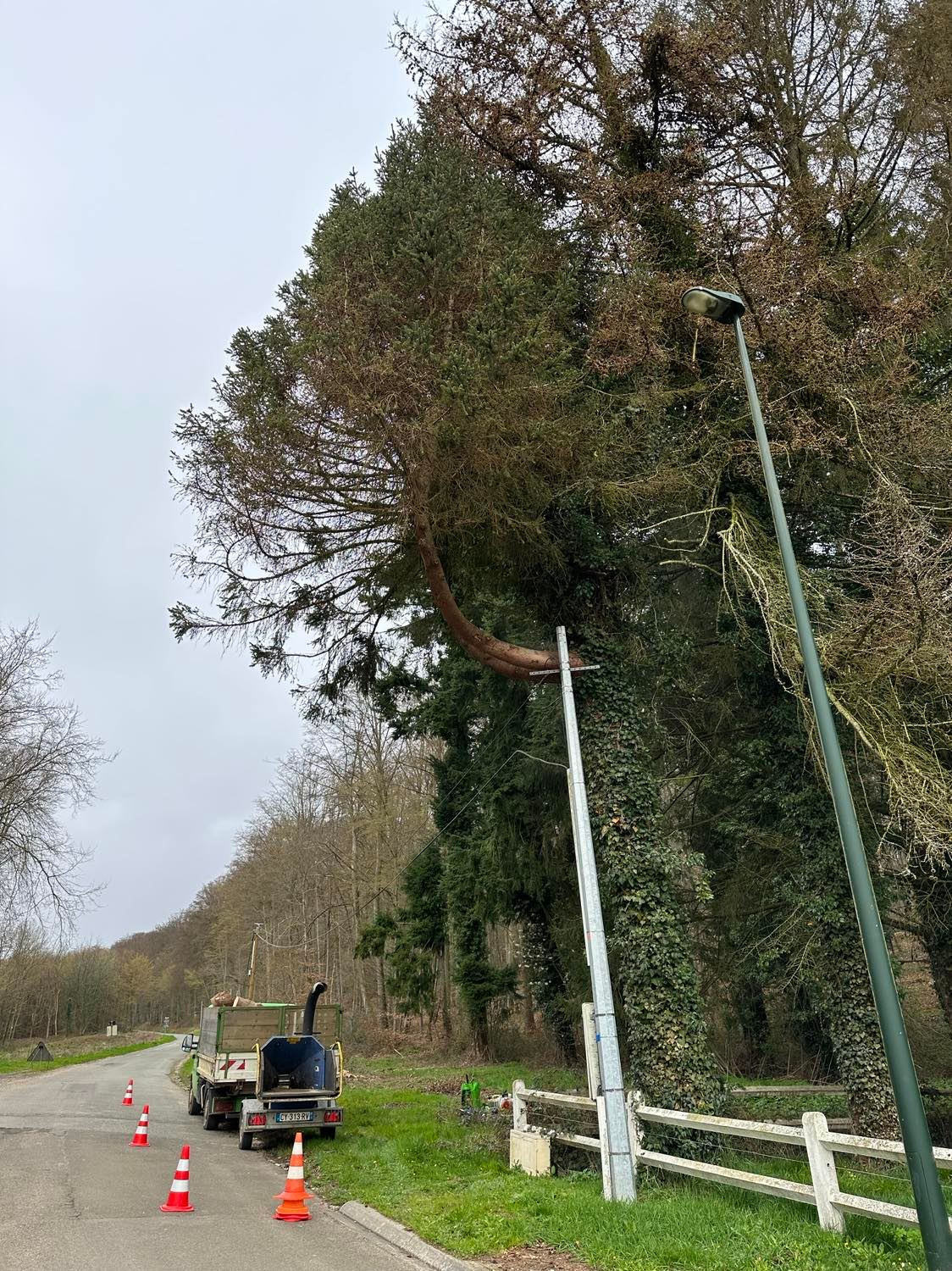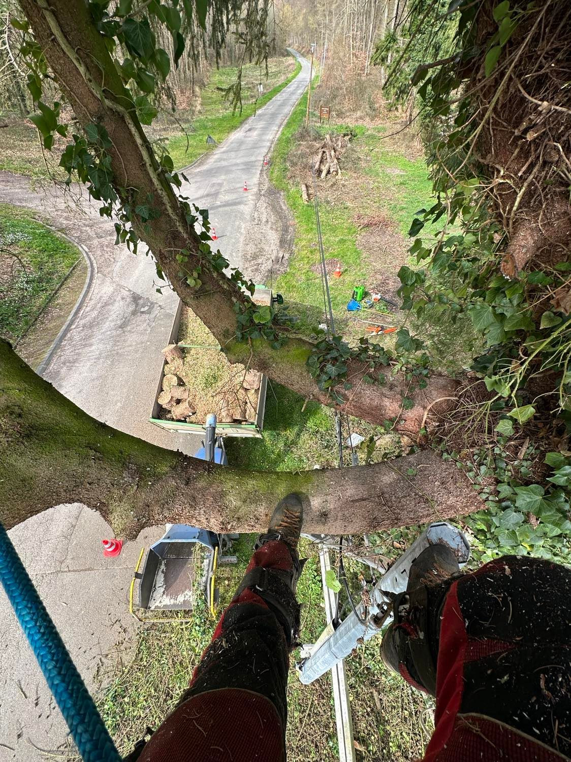Abattage par démontage en bord de route d’un épicéa du Colorado, d’un épicéa commun et d’un mélèze.