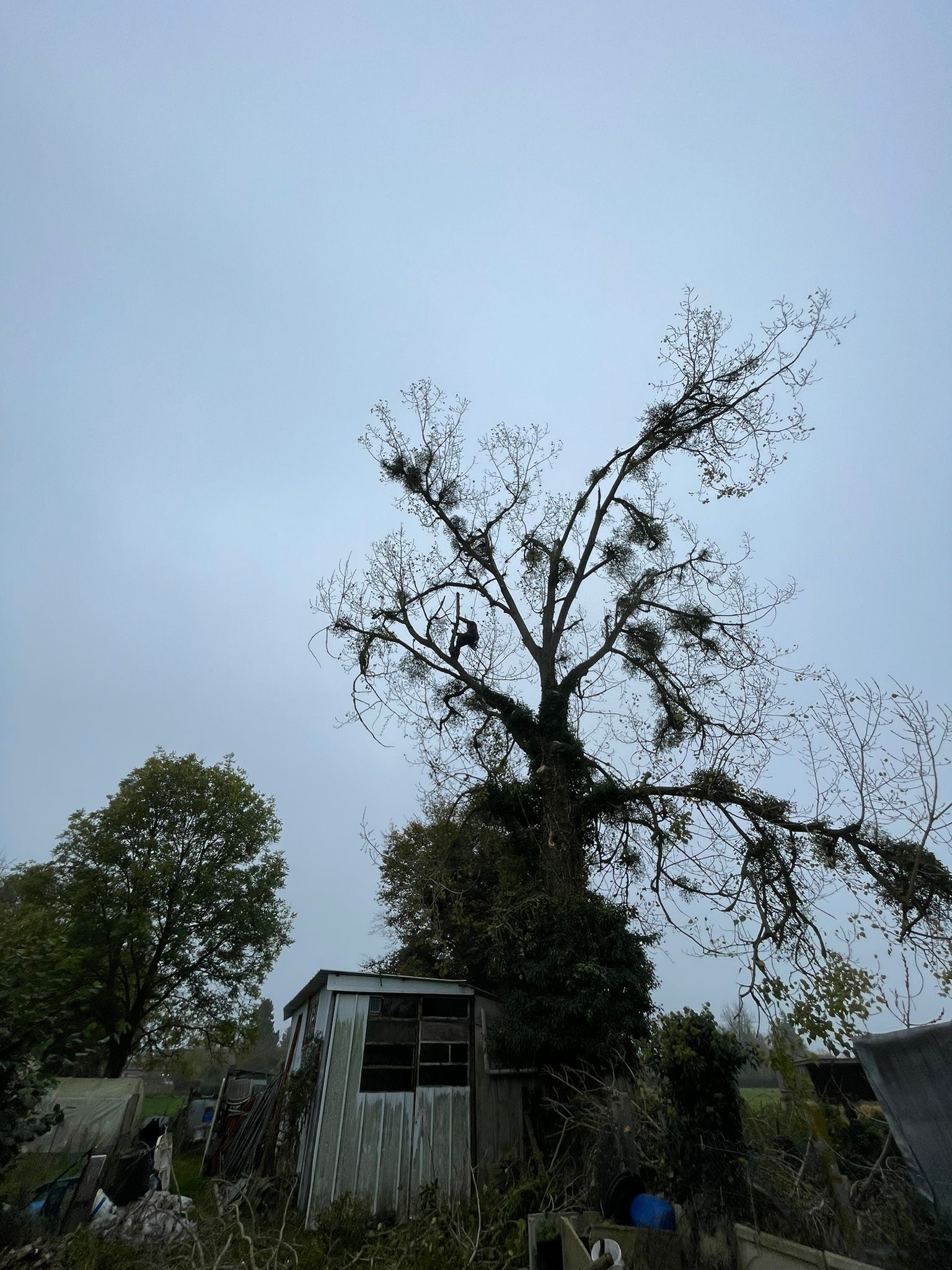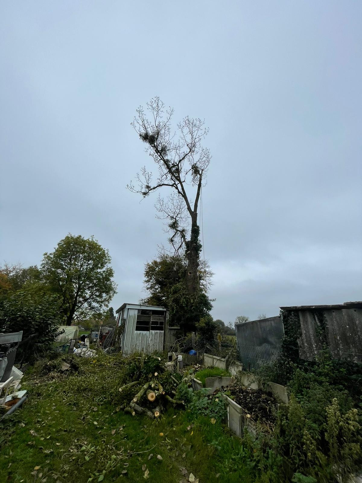 En accord avec le client le bois ainsi que les branches on été laissé sur place pour pouvoir s'adapter au budget de celui-ci, tout en mettant en sécurité l'environnement avoisinant l'arbre. Malheureusement atteint par un pathogène dégradant le bois et ayant une incidence sur sa solidité.