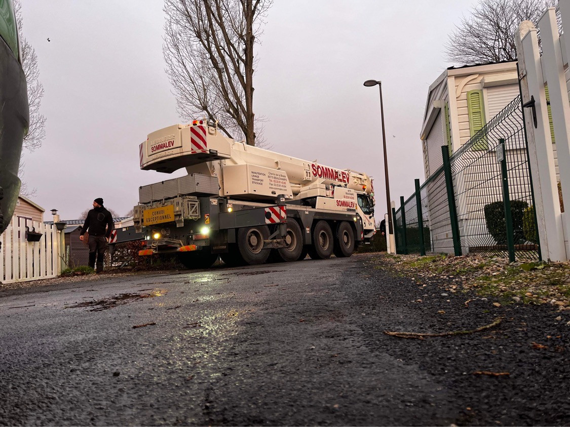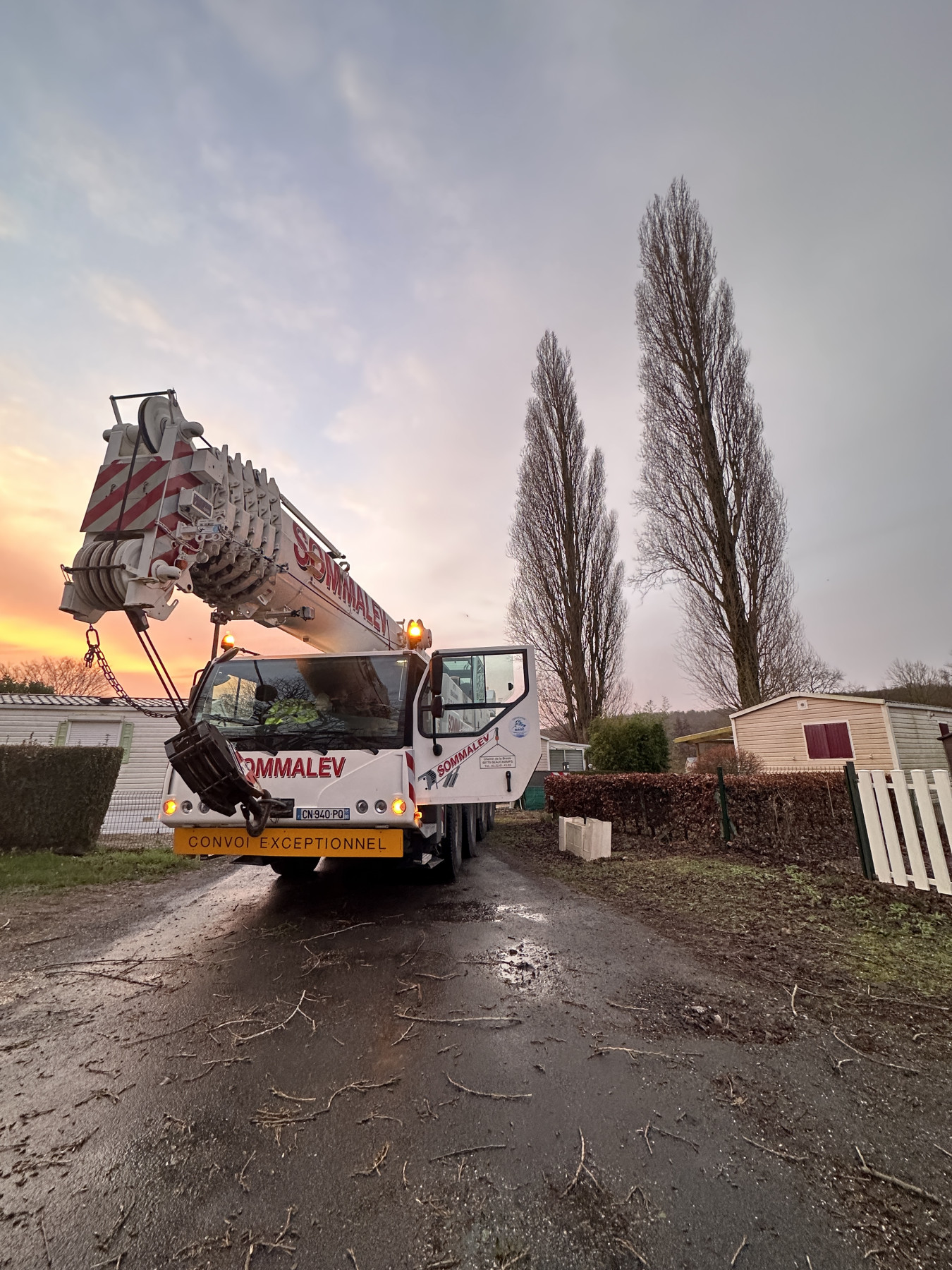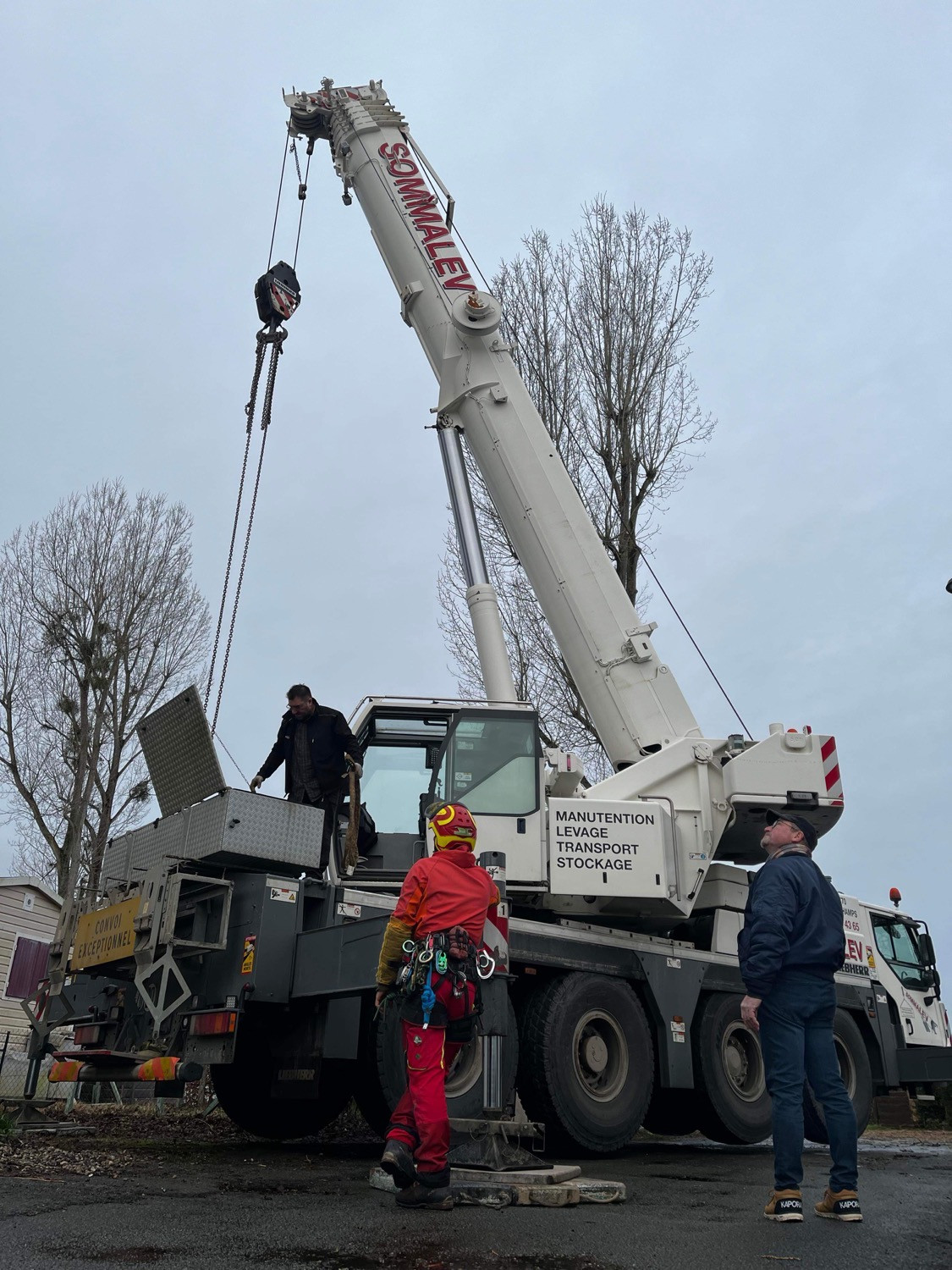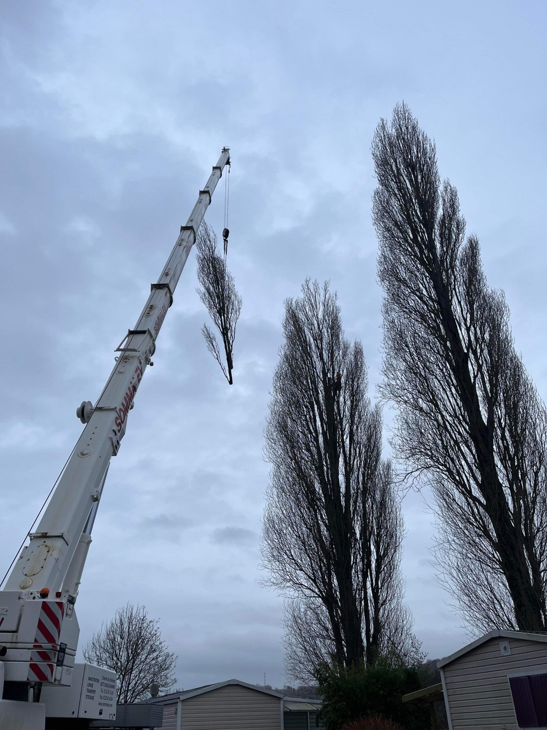 Abattage d'arbres délicats dans un environnement inaccessible pour la réalisation d'un démontage classique, le choix de l'utilisation d'une grue mobile à été fait pour pouvoir extraire les charges de bois et de branches de manière rapide et efficace.