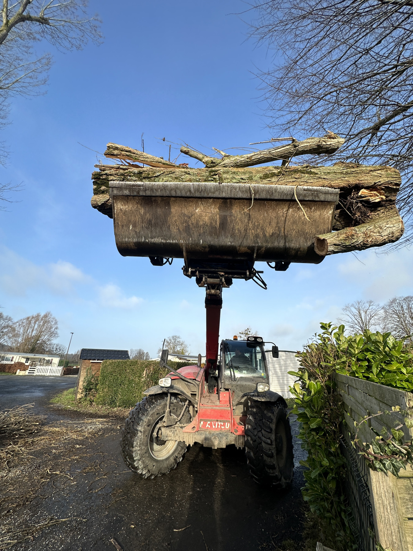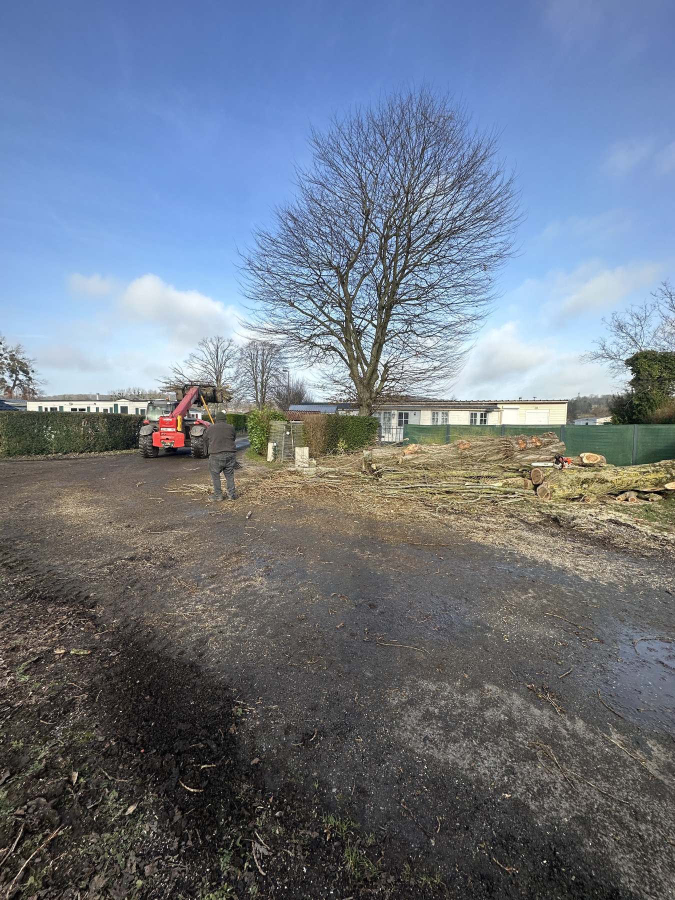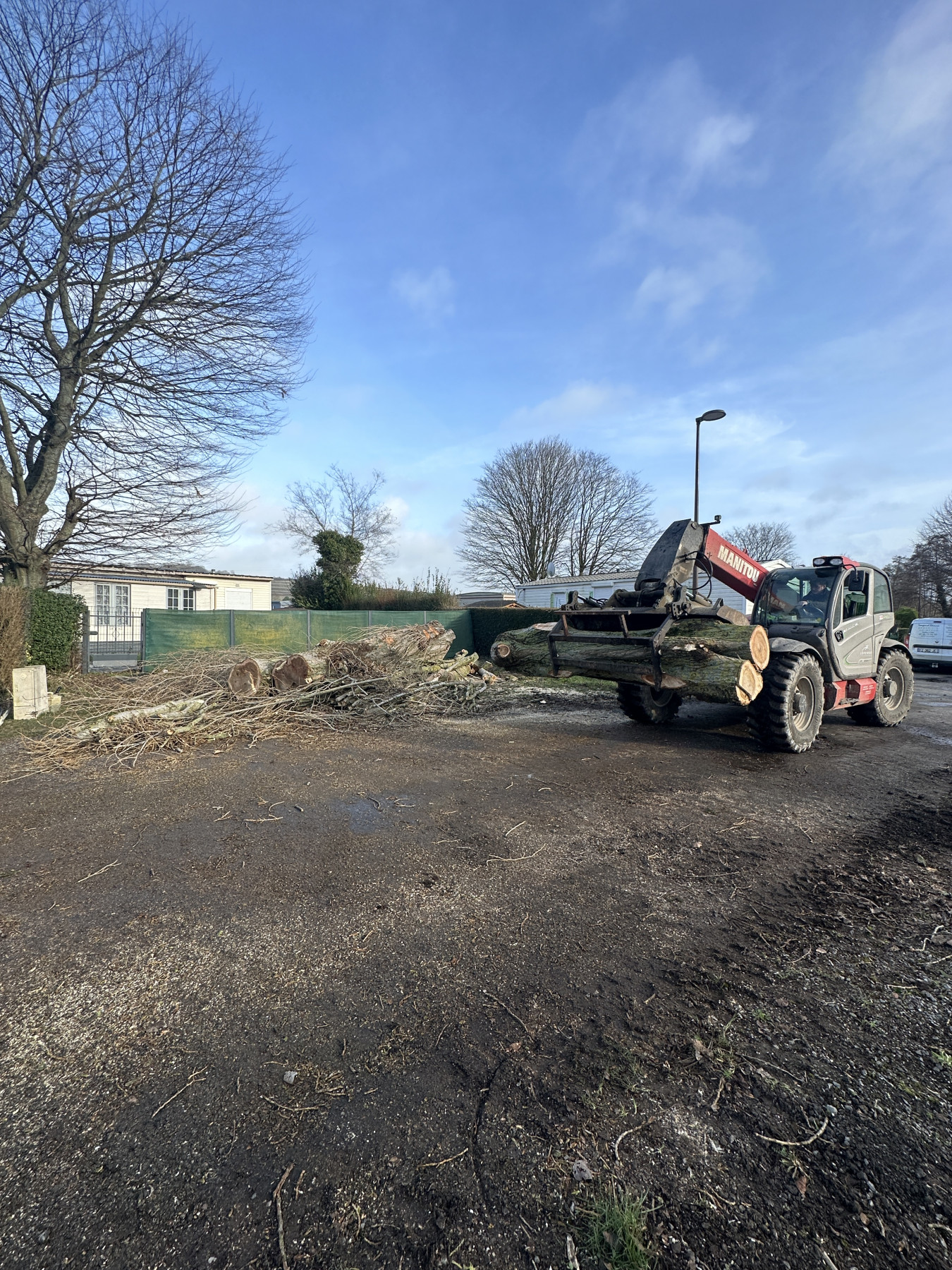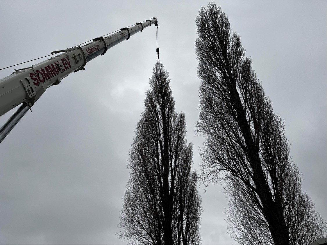 Suppression de deux peupliers d'Italie d'environ 30 mètres de hauteur pour un total de plus de 20 tonnes de bois evacué à l'aide de matériel agricole.