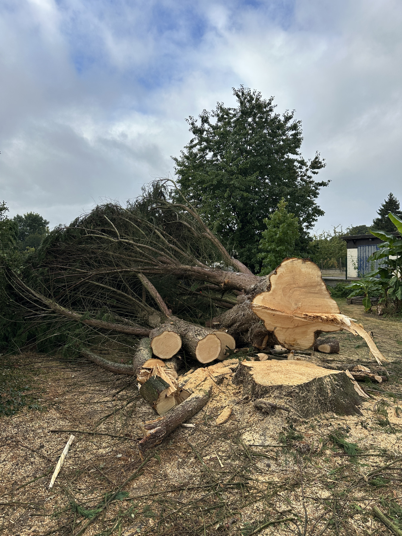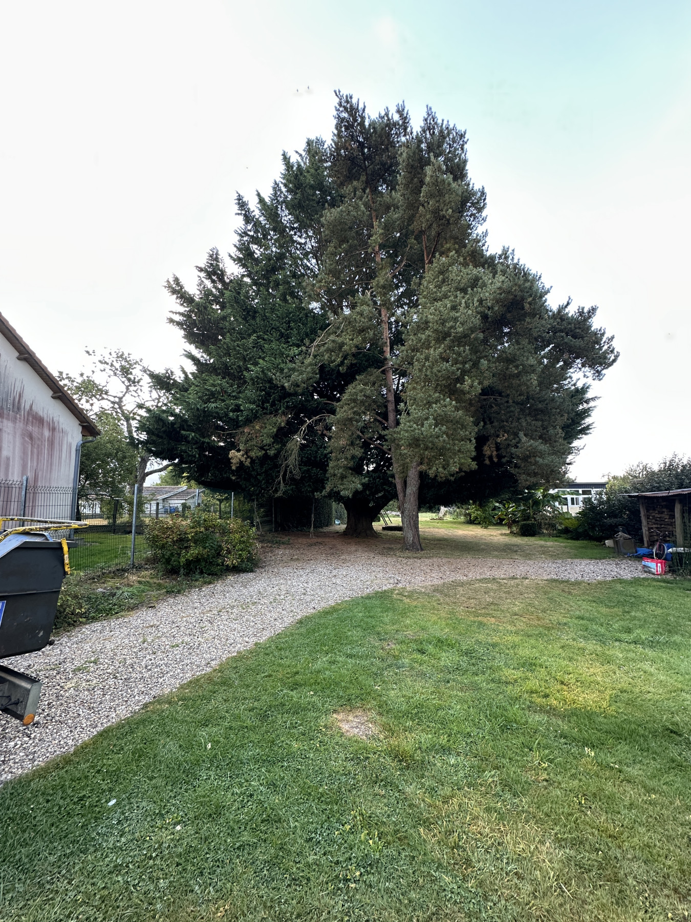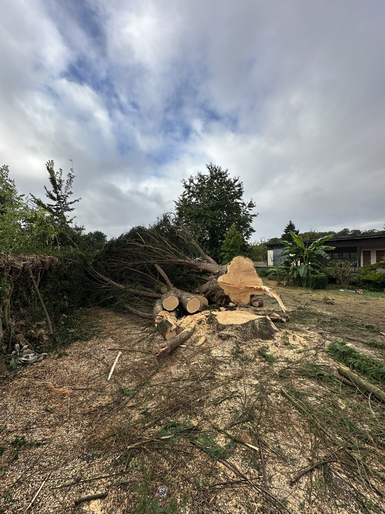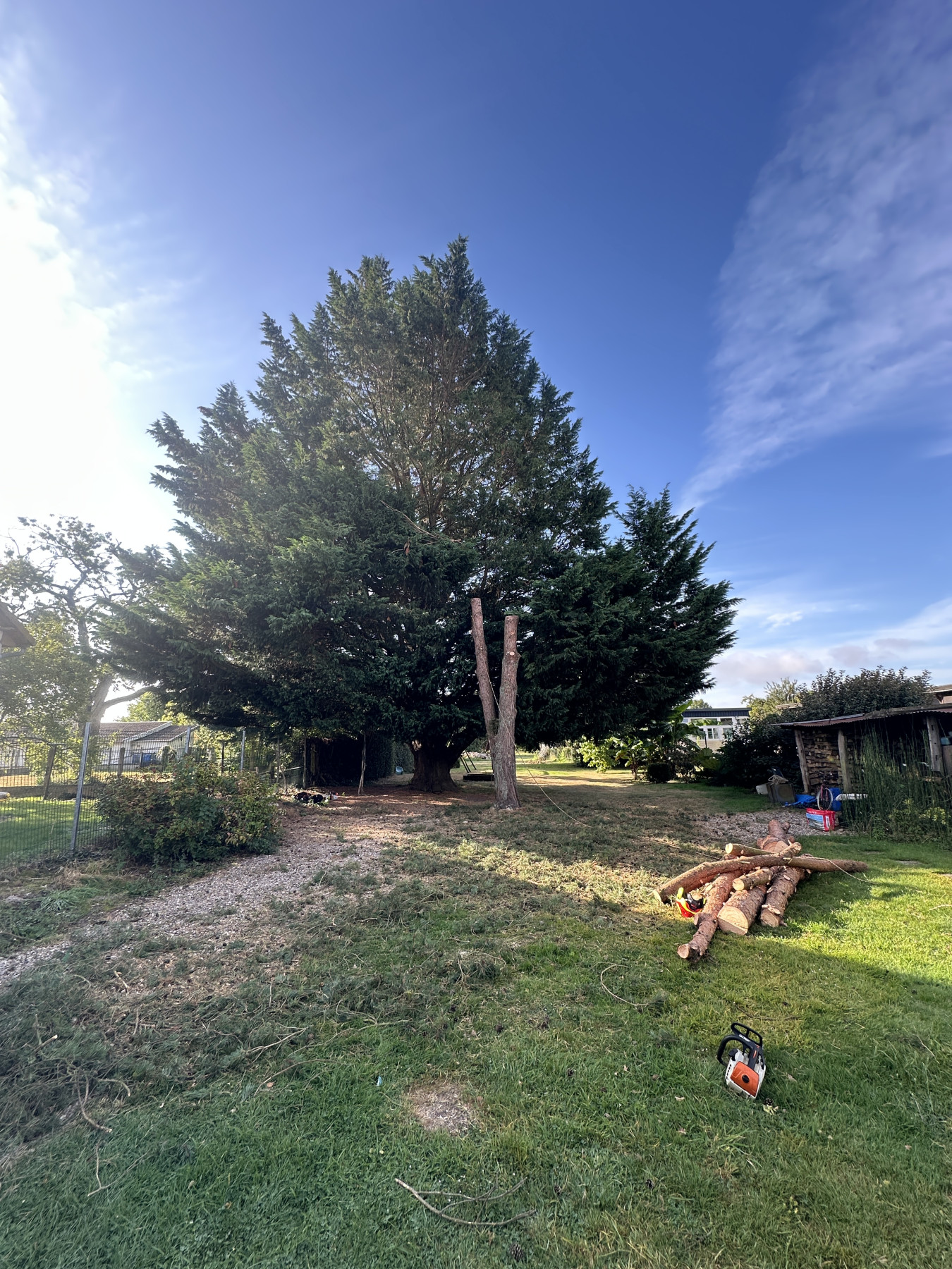 Abattage délicat d'un Cyprès de Lawson surplombant trois limites de propriété, cet arbre ayant un état sanitaire correct à été abattu car son environnement assez restreint rendait difficile son développement.