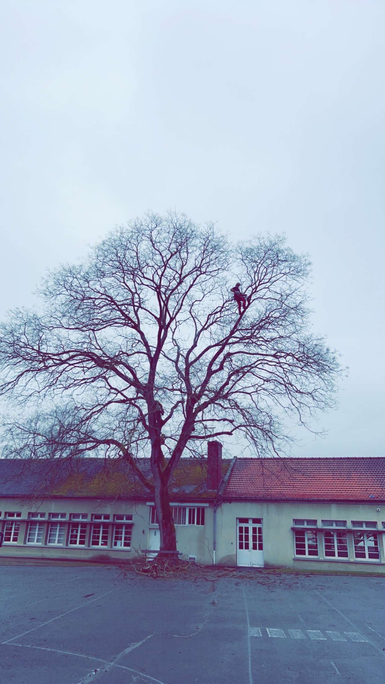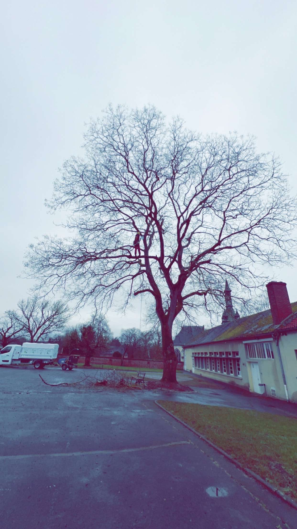 minutieusement sur corde pour pouvoir atteindre chaque branches morte ou dépérissantes qui risquaient de mettre en danger les écoliers.