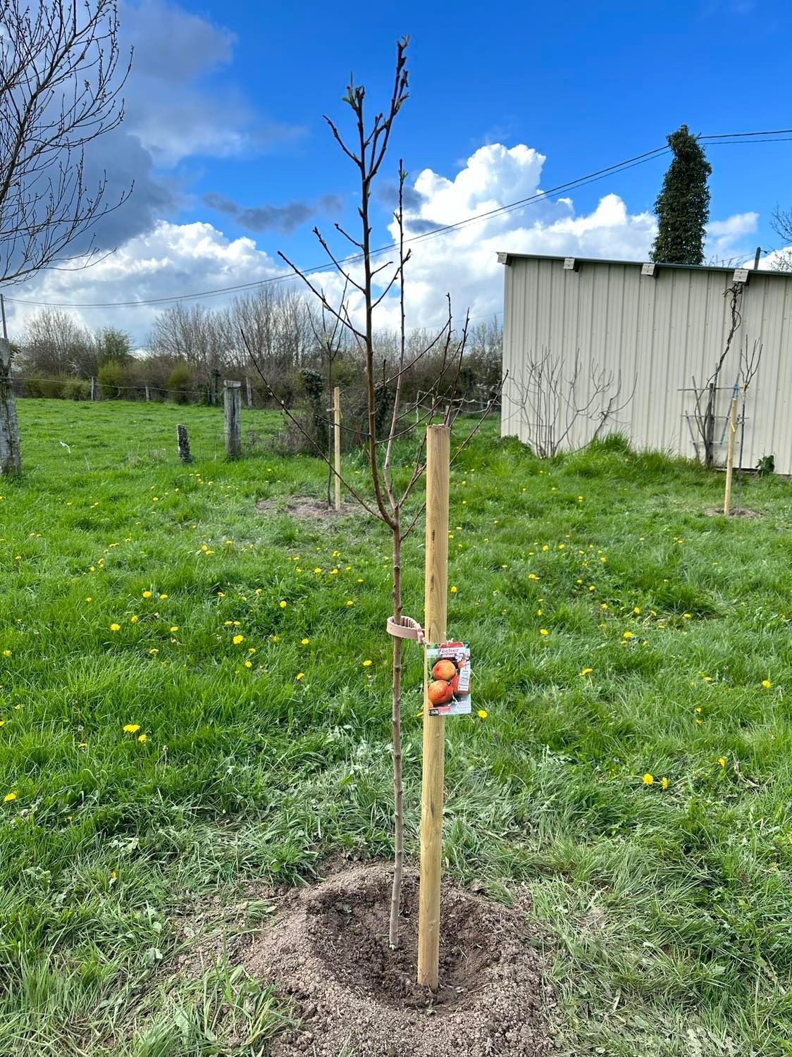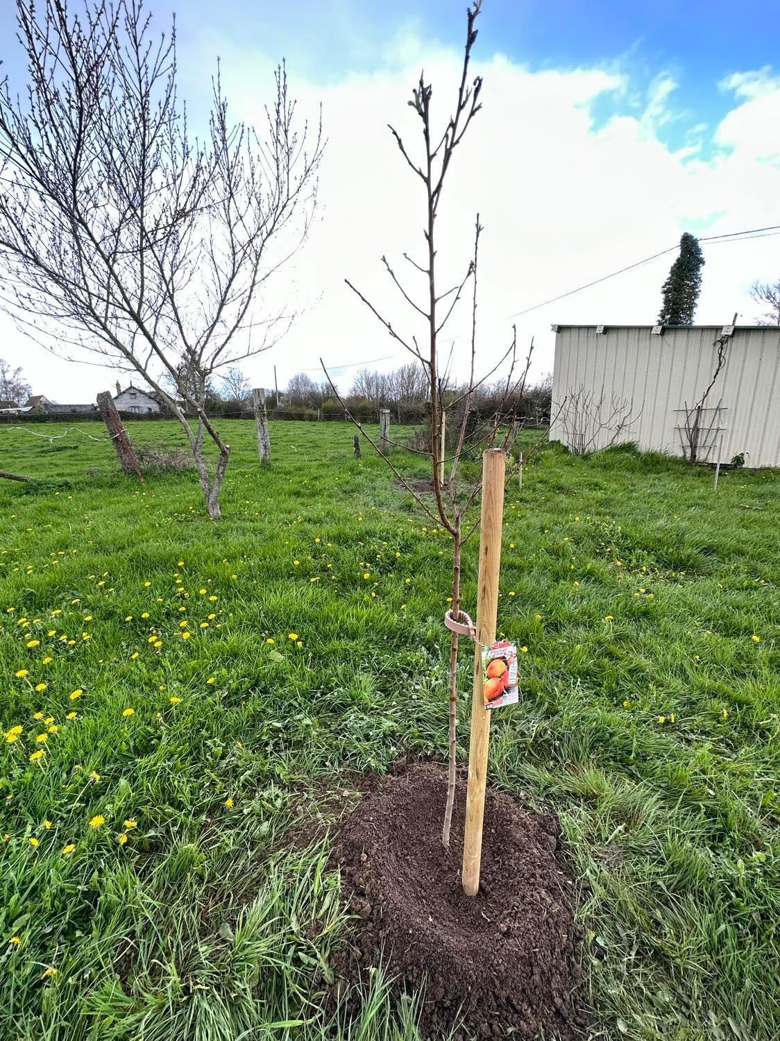 Plantation de divers arbres fruitiers, pommier, abricotier, prunier, pêcher, cognassier, kaki, kiwi, baie de goji et vignes. Plantation en potet travaillé avec amendement pour favoriser la reprise du système racinaire. Mise en place de tuteurs et systèmes de maintien, pose d’une clôture électrique type cheval avec des poteaux en pin.
